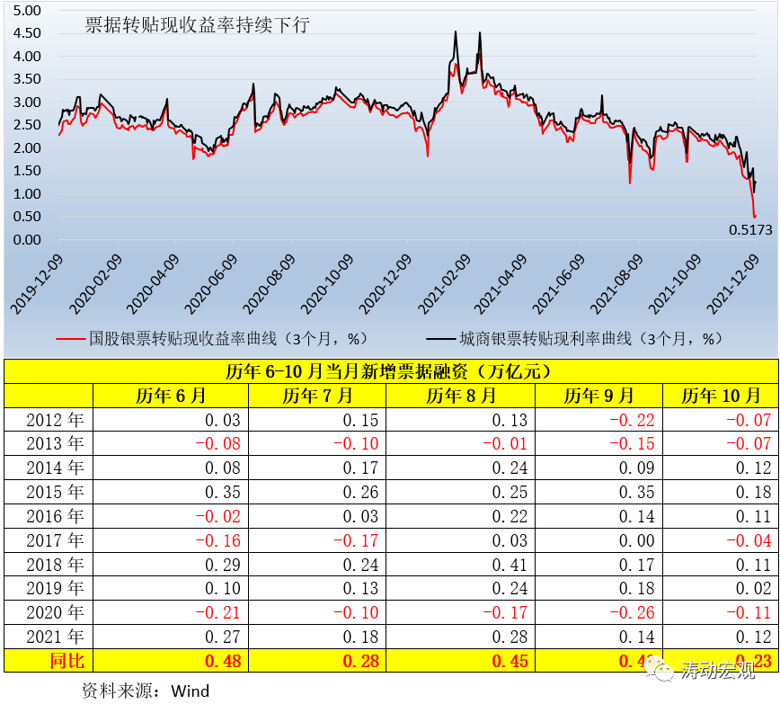 1、今年6月、7月、8月、9、10月和11月當月新增票據融資分別達到0.27萬億、0.18萬億、0.28萬億、0.14萬億、0.12萬億和0.16萬億元,同比分別多增0.49萬億、0.28萬億、0.45萬億、0.40萬億、0.23萬億和0.03萬億,也就是說6-11月期間票據融資累計多增了1.87萬億。這其中的背景便是,3個月銀票轉貼現收益率持續(xù)下行,特別是10月以來已累計下行200BP至0.50%附近。