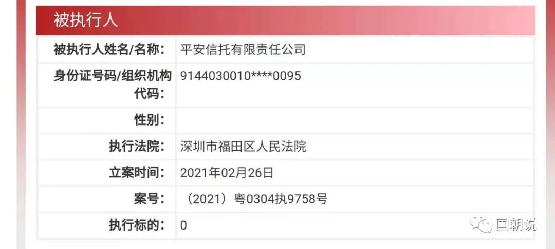 2021年2月26日,平安信托有限責(zé)任公司被深圳市福田區(qū)人民法院列為被執(zhí)行人,案號(hào)粵0304執(zhí)9758號(hào),執(zhí)行標(biāo)的顯示為“0”元,由于中國(guó)執(zhí)行信息公開(kāi)網(wǎng)上并沒(méi)有提供更多信息,從案號(hào)上來(lái)看,這或許跟一樁集合信托糾紛案有關(guān)。
