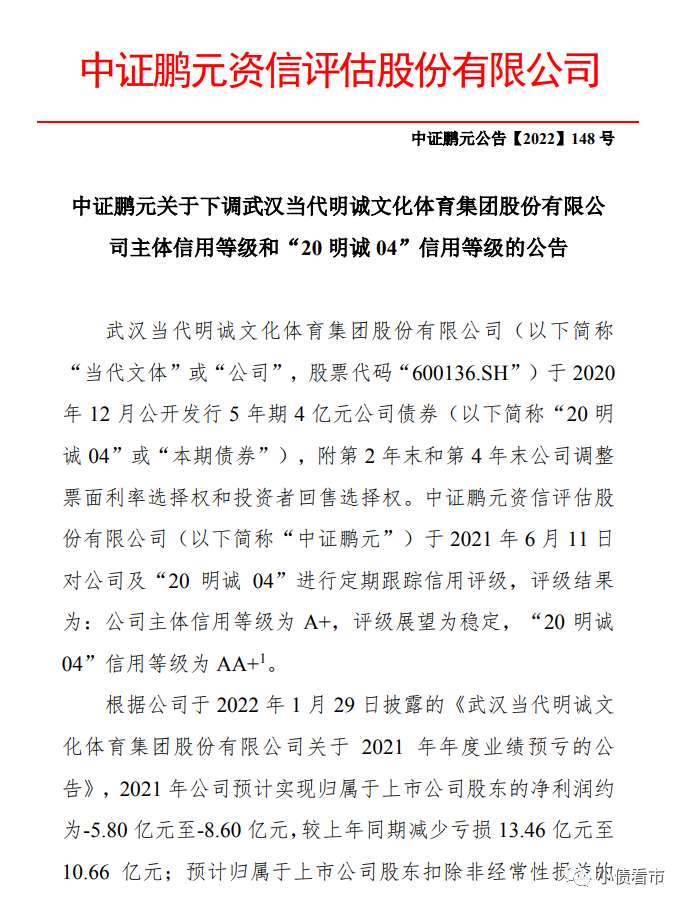 公告顯示,當代文體2021年業績預計持續大額虧損,商譽仍存在減值風險,債務負擔沉重,再融資能力一般,面臨較大的流動性壓力,本期債券擔保方武漢當代科技產業集團股份有限公司償債能力明顯下滑。