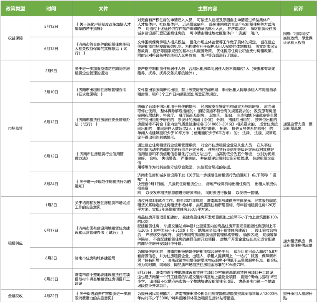 上海、廣州、重慶、杭州、西安、成都、合肥、海口等城市政策主要集中在強(qiáng)化市場(chǎng)風(fēng)險(xiǎn)監(jiān)管方面。濟(jì)南在租賃供給、監(jiān)管和權(quán)益保障等多方面均有相關(guān)政策的推出,力度較大;具體在租售同權(quán)、增加房源供應(yīng)、搭建監(jiān)管平臺(tái)、對(duì)企業(yè)和租客實(shí)施補(bǔ)貼方面全方位推進(jìn)。