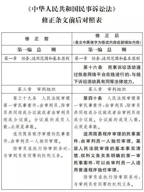 二、新增 “第十六條 民事訴訟活動通過信息網絡平臺在線進行的,與線下訴訟活動具有同等法律效力”。