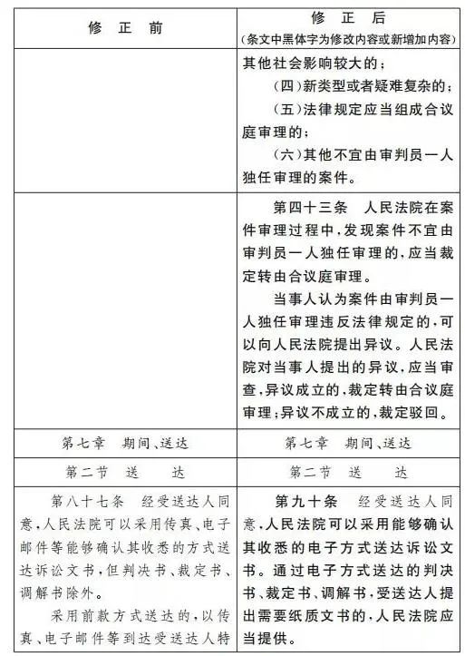 三、《草案》第九十條將電子送達途徑由“傳真、電子郵件等”改為“電子方式”,同時將現行的“但判決書、裁定書、調解書除外”改為“通過電子方式送達的判決書、裁定書、調解書,受送達人提出需要紙質文書的,人民法院應當提供”。
