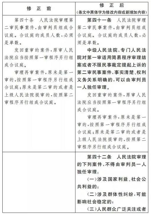 七、另外新增了獨任審判員制度可適用一審普通程序和二審程序的規定,同時將獨任審判員的適用條件以消極條件的方式列出。