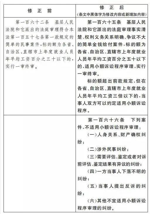 五、小額訴訟程序適用標的額從原來的“各省、自治區、直轄市上年度就業人員年平均工資百分之三十以下”提升到“百分之五十以下”,新增當事人合意選擇適用模式。
