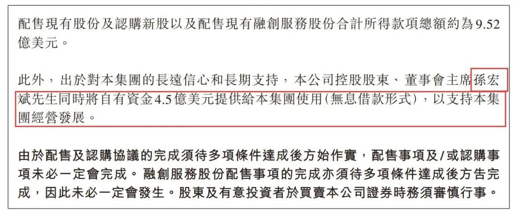 11月14日,融創(chuàng)中國(guó)公告披露:融創(chuàng)的董事會(huì)主席孫宏斌先生,將自有資金4.5億美元無(wú)息提供給集團(tuán),以支持融創(chuàng)的經(jīng)營(yíng)發(fā)展。