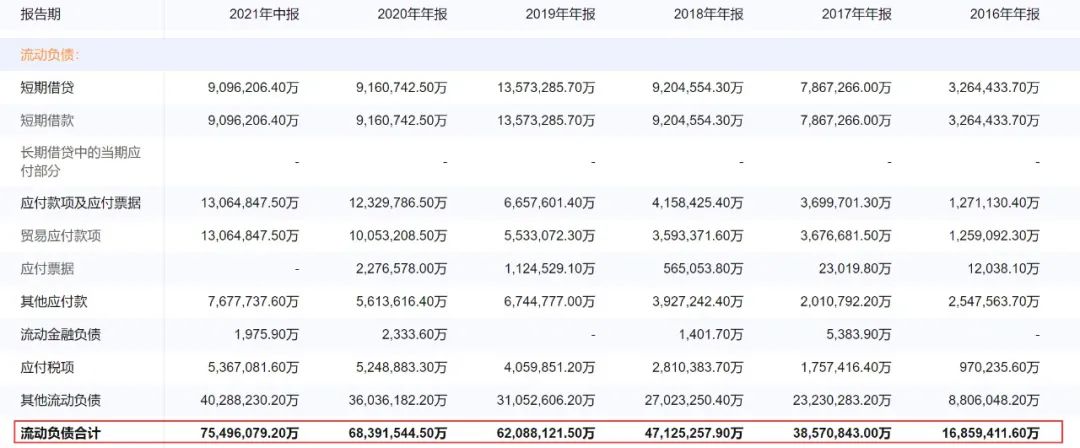 順便杠桿地產(chǎn)也看了下恒大同期的流動(dòng)負(fù)債,2021中期約為1.57萬(wàn)億元,2020末期約為1.51萬(wàn)億元。