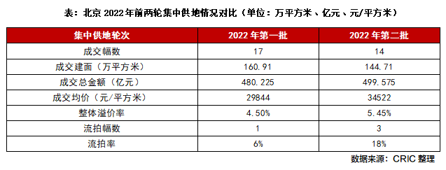 5月31日至6月1日,北京率先完成第二輪集中供地的出讓,共成功出讓14宗含宅用地,4宗地塊觸及最高限價,其中1宗仍待通過競高標準方案確定競得人,成交總建面144.71萬平方米,成交總價近500億元,平均溢價率5.45%,較首輪微漲,但本輪產生3宗流拍地塊,區域市場冷熱不均,房企投資信心仍有不足。