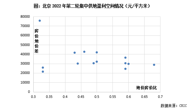 從盈利空間角度看,本輪北京土拍地價房價比平均值為0.49,房地價差也均在2萬元/平方米以上。