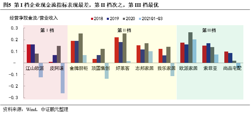 大宗業(yè)務(wù)占比高或大宗客戶風(fēng)險大的樣本企業(yè)經(jīng)營現(xiàn)金流弱化。2021年下半年以來房企流動性緊張,直接影響定制家居企業(yè)回款。江山歐派和皮阿諾經(jīng)營現(xiàn)金流指標(biāo)在2021年1-9月出現(xiàn)明顯的下滑,頂固集創(chuàng)由于積極推進大宗業(yè)務(wù),業(yè)務(wù)合作保證金支出較大拖累經(jīng)營現(xiàn)金流,我樂家居2021年半年報顯示其應(yīng)收賬款前五大均為恒大地產(chǎn)、華夏幸福及金科地產(chǎn)的關(guān)聯(lián)企業(yè)。尚品宅配不涉及大宗業(yè)務(wù),其經(jīng)營現(xiàn)金流指標(biāo)弱化則是由于戰(zhàn)略調(diào)整,全面轉(zhuǎn)型整裝業(yè)務(wù)所致。