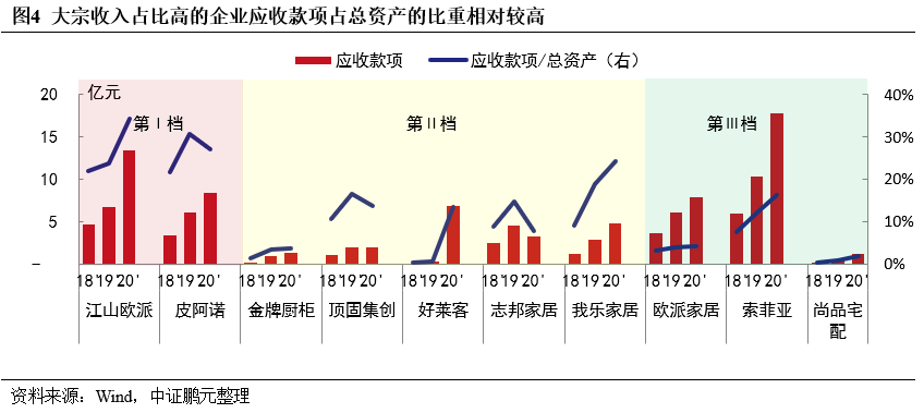 本次房企風(fēng)險暴露,通過大宗業(yè)務(wù)傳導(dǎo),直接影響定制家居企業(yè)的收入及回款。大宗業(yè)務(wù)“量大利薄賬期長”,會拖累企業(yè)應(yīng)收款項周轉(zhuǎn)效率,導(dǎo)致其經(jīng)營現(xiàn)金流弱化,甚至引發(fā)回款風(fēng)險,已有江山歐派、皮阿諾、頂固集創(chuàng)、我樂家居等企業(yè)被曝持有的恒大商票等款項逾期;大宗業(yè)務(wù)毛利率本就低于零售渠道且呈下降趨勢,未來如轉(zhuǎn)向同優(yōu)質(zhì)房企合作,預(yù)計毛利率仍將承壓。相比之下,龍頭企業(yè)受影響較小,中部、尾部企業(yè)受波及程度大,大宗業(yè)務(wù)占比高、合作房企負(fù)債率高的企業(yè)影響更甚。