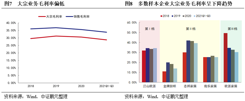 大宗業(yè)務(wù)“量大利薄”,其增速放緩對第I、II檔企業(yè)及中小規(guī)模企業(yè)影響較大,未來競爭加劇,其盈利空間將持續(xù)被壓縮。大宗業(yè)務(wù)經(jīng)歷2018-2019年的快速增長,2020年受疫情、地產(chǎn)調(diào)控等影響增速放緩,2021年以來地產(chǎn)調(diào)控升級,房企資金壓力上升,雖然企業(yè)積極拓展同優(yōu)質(zhì)房企的合作,卻未能阻止大宗業(yè)務(wù)增速下滑。2021年三季度江山歐派、我樂家居的大宗業(yè)務(wù)分別同比下降24.11%和14.62%。