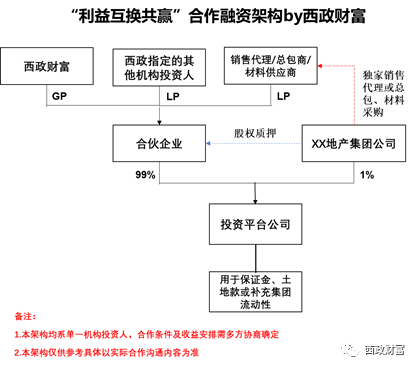 1. 西政作為GP與總包商/材料供應商/房產銷售代理商以及其他機構投資人共同成立合伙企業。