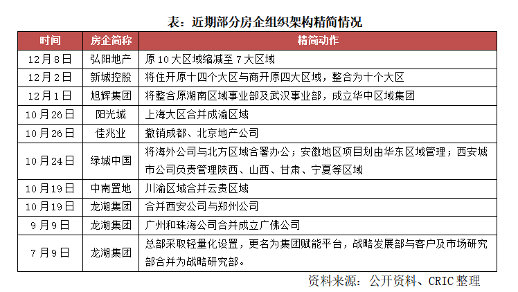 此外,房企組織架構調整的同時均涉及一定的人員配置精簡及戰略的聚焦。例如,新城控股于12月初將住宅開發事業部和商業開發事業部進行大區合并,由原十四+四個大區整合為十個大區,同時伴隨人員調整,事業部總部開啟縮編、轉崗和分流;弘陽地產在縮減合并區域的同時,涉及七大區域負責人和人員的調整變動;同時中層員工也根據區域新的組織架構轉崗、更換城市或個人意愿進行小比例調整,管理團隊更為精簡。