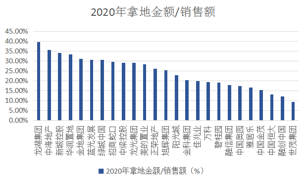事實(shí)上,從2020年30強(qiáng)開發(fā)商拿地金額與年度銷售額之比來看,絕大部分30強(qiáng)開發(fā)商實(shí)際拿地金額與銷售比大約在15%~30%,其中龍湖集團(tuán)、中海地產(chǎn)占比較高,分別為39.57%、35.55%。