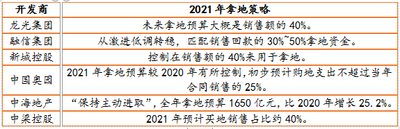 睿和智庫對30強(qiáng)開發(fā)商2021年的經(jīng)營策略進(jìn)行統(tǒng)計(jì)分析,在拿地態(tài)度上,30強(qiáng)開發(fā)商大都已經(jīng)從激進(jìn)到轉(zhuǎn)穩(wěn),“審慎”、“謹(jǐn)慎”、“放緩”成為拿地關(guān)鍵詞。部分開發(fā)商在年報(bào)或業(yè)績說明會上,已明確提出將拿地預(yù)算控制在銷售額的40%以內(nèi)。