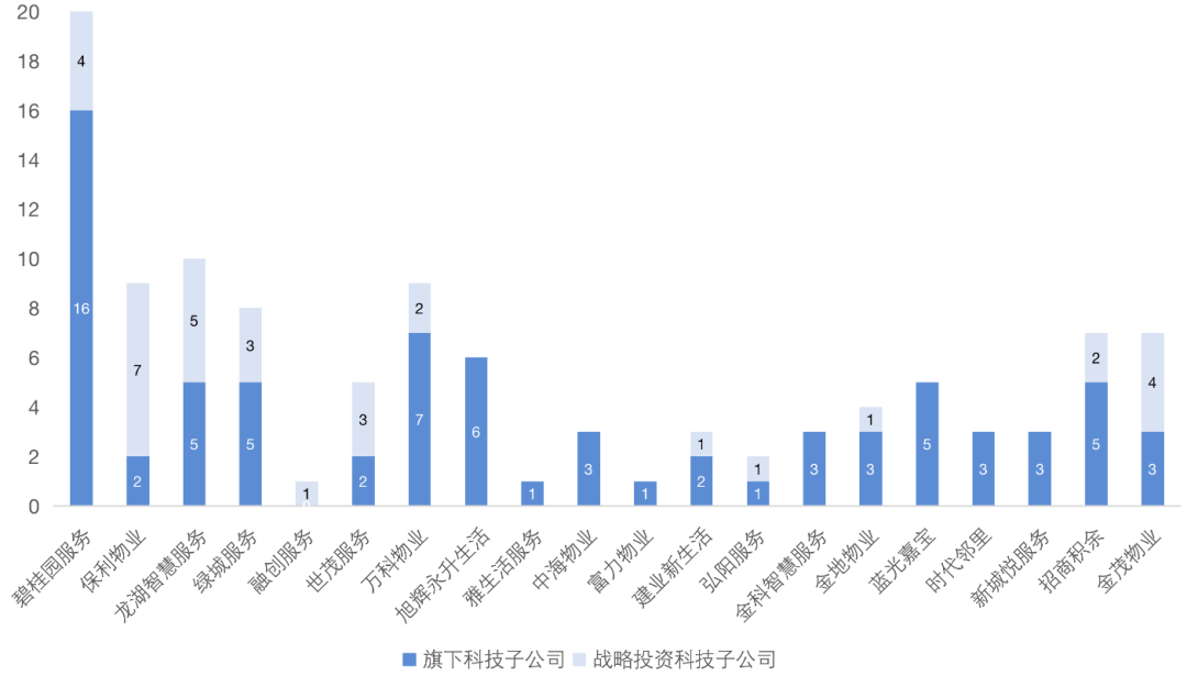 根據克而瑞發布的2020年度中國地產數字力TOP20物企榜單來看,前20的頭部物企正在積極成立或戰略投資科技公司,為企業數字化管理賦能。目前,這些企業旗下共有110家科技公司被孵化或戰略投資。