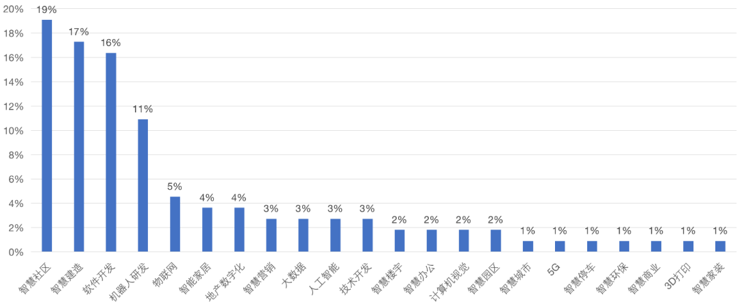 同時,成立或投資的科技企業所涉及的業務類型較廣,據克而瑞科創統計分析,科技企業的業務方向達到22個,其中智慧社區、智慧建造、軟件開發占據前三位,分別占比19%、17%和16%。目前,軟件開發行業的技術已經基本趨向于成熟,對于房企來說,布局軟件開發的科技企業相對比較容易,因此軟件開發的科技企業數量較多。但是進軍一個科技垂直化領域并非一件易事,從統計數據來看,物企所投資的科技企業現階段更多是處在智慧社區和智慧建造兩個領域。