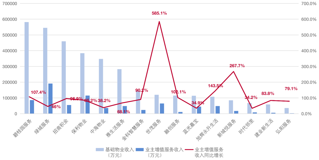 根據克而瑞科創的統計結果顯示,TOP20的物企盡管收入仍主要來自基礎物業服務,但增值服務的收入增長率非常高,從公司的年報和招股書上可以看出,各家都在積極部署多元化的社區增值服務以提高公司的毛利率,滿足業主日益增長的個性化需求。