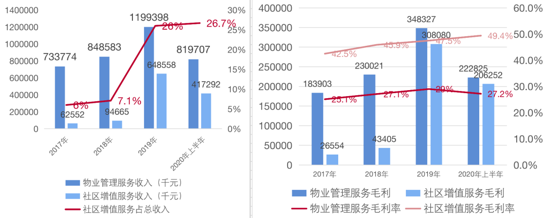 據世茂服務招股數據顯示,除了日益增長的基礎服務收入外,社區增值服務取得巨大增長。所得收入占總收入的百分比由2017年的6.0%上升至2018年的7.1%及2019年的26.0%,并進一步上升至截至2020年前六個月的26.7%。毛利率也由27.5%上升至33.7%。