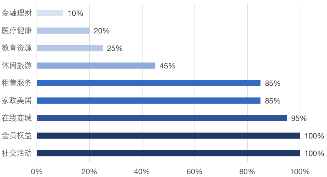 從頭部各家物業服務的部署情況可以看出,針對智慧通行、在線繳費、管家服務、公告資訊、移動平臺等物業基礎服務功能已基本具備。而在業主增值服務方面卻表現的層次不齊,在線商城、家政美居、房屋租售服務、會員權益以及社區社交活動是目前頭部企業關注度比較高的,而在醫療健康、教育、旅游和金融理財等方面的投入較少。這是因為目前增值服務尚處于一個探索和初步發展的階段,還沒有形成成熟的業務模式,物企也還不具備完善的運營服務和整合多元化產業資源的能力。