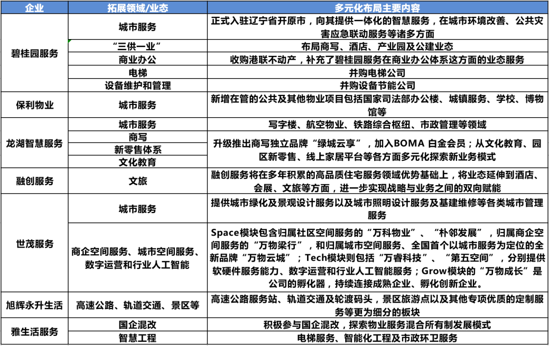 由于傳統物業行業發展的天花板,多元化的經營布局有利于持續釋放市場空間,這些領域具有細分賽道多,專業能力和門檻較高的特點,先進入者將具有先發優勢,發展前景可期。