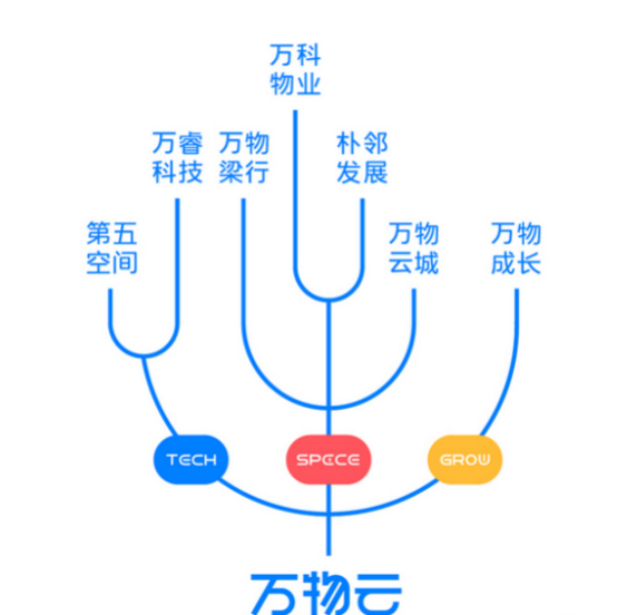 萬物云把原來的物業版塊一分為三,包含Space、Tech和Grow三大模塊。其中,Space模塊包含歸屬社區空間服務的“萬科物業”、“樸鄰發展”,歸屬商企空間服務的“萬物梁行”,和歸屬城市空間服務、全國首個以城市服務為定位的全新品牌“萬物云城”;Tech模塊則包括“萬睿科技”、“第五空間”,分別提供軟硬件服務能力、數字運營和行業人工智能服務;Grow模塊的“萬物成長”是公司的孵化器,持續連接成熟企業、孵化創新企業。