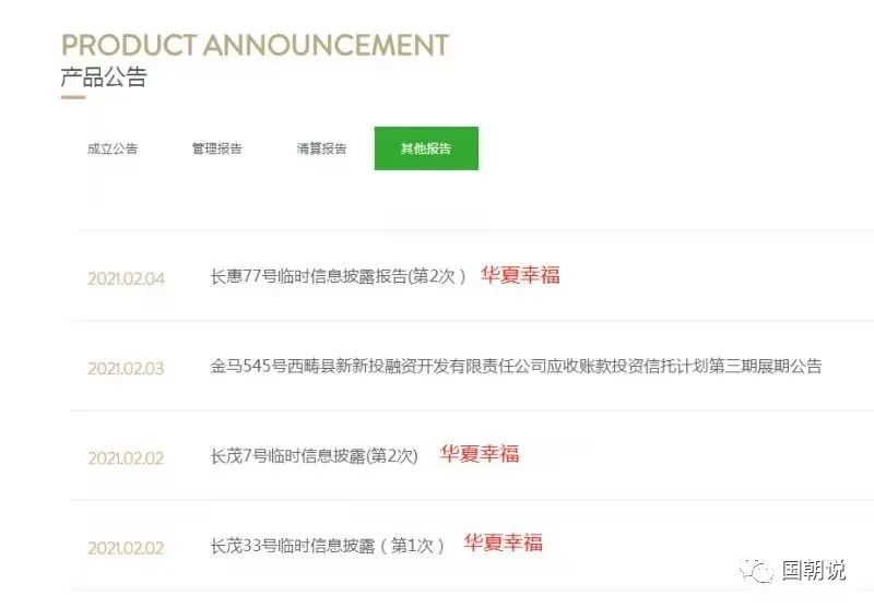 上述3個信托計劃臨時信息披露報告顯示:“擔保人華夏幸福基業股份有限公司(以下簡稱“華夏幸福” ) ( 600340 )于 2021年2月2日發布公告稱,因受宏觀經濟環境、行業環境、信用環境疊加多輪疫情影響,出現階段性緊張,導致出現部分債務未能如期償還。截至公告發布日,華夏幸福及下屬子公司發生債務逾期涉及的本息余額為 52.55 億元,涉及銀行貸款、信托貸款等債務形式,目前正在與逾期涉及的金融機構積極協商展期相關事宜。同時,華夏幸福金融機構債權人委員會組建暨第一次會議在 2021年2月1日召開,我公司委派代表參加該次會議。會議之相關內容,經會議主辦機構審核后會統一向參會機構正式發布,我公司屆時將向委托人/受益人如實披露。”