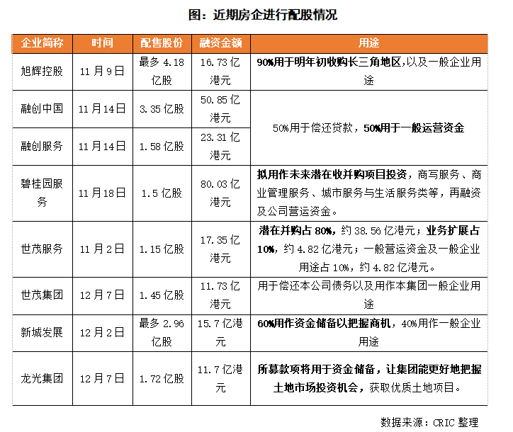 在政策回暖的同時(shí),房企也在積極自救,通過項(xiàng)目轉(zhuǎn)讓、股東借款等方式補(bǔ)充現(xiàn)金流,還有部分房企繼續(xù)通過配股融資的方式募集資金,為新一輪的償債潮做準(zhǔn)備,也為明年新一輪的投資機(jī)會(huì)儲(chǔ)備資金。