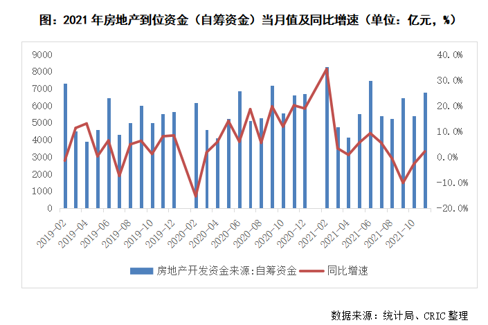 從房地產(chǎn)開發(fā)企業(yè)到位資金(自籌資金)來看,11月單月值為6761億元,單月資金量年內(nèi)僅次于6月,從增速來看,同比增長2.1%,增速自8月后首次重新回正。