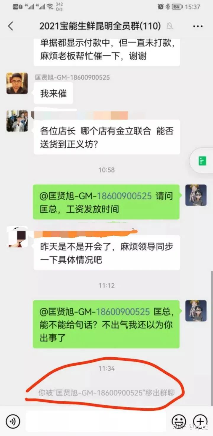 昆明寶能生鮮的員工在工作群問工資發放時間,并艾特城市總。一刻鐘后,見剛剛還活躍的領導沒有回話,這位員工再次詢問“能不能給句話?不出氣我以為你出事了”。