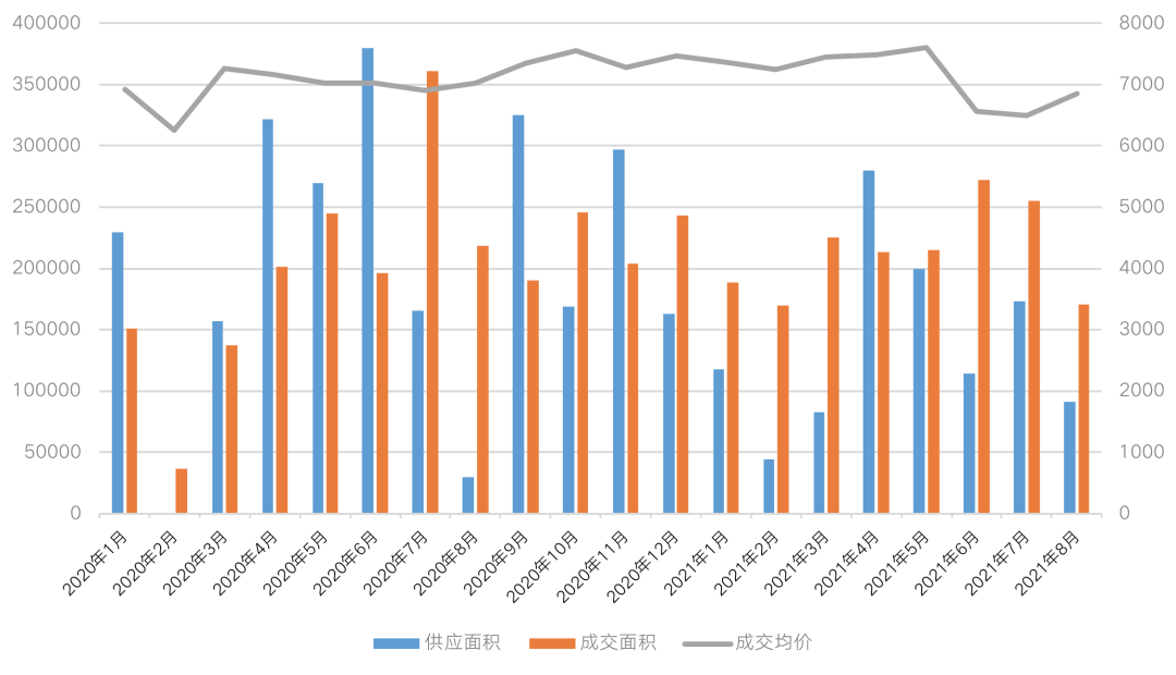 2018年,岳陽樓市開始轉冷,市場開啟下行趨勢,四季度時房價由2017年最高9000元/平米降至7000元/平方米左右,價格逐漸回歸穩定,至今年8月房價跌破7000元/平方米。從銷售數據來看,2020年以來,月度成交套數基本維持在1500套左右,今年六七月,受大幅降價影響,成交高位運行,分別成交2228套和2286套,成交價格跌至7000元/平方米以下。