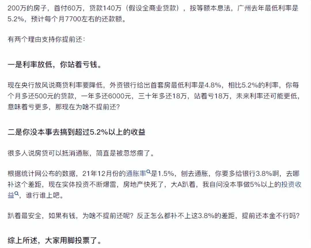 但是,如果你對未來收益預期不高,并且不想生活為房貸所累,提前還房貸也不是不可以。