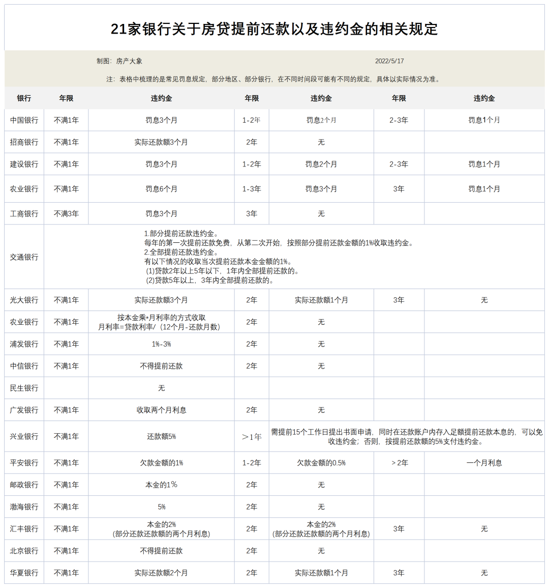 表格中梳理了一些常見規定,具體以簽的貸款合同為準,合同上會寫明提前還款的違約金額是多少,簽字之前記得自己看看。