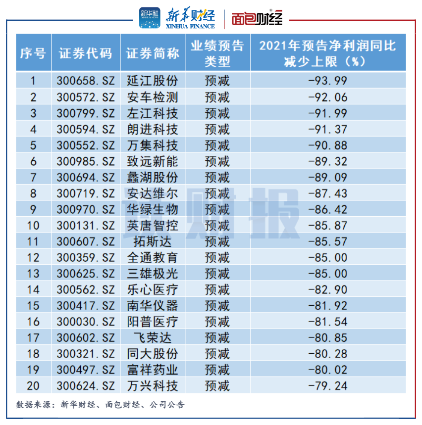 圖3:2021年創業板歸母凈利潤同比預減幅度排名(前20位)
