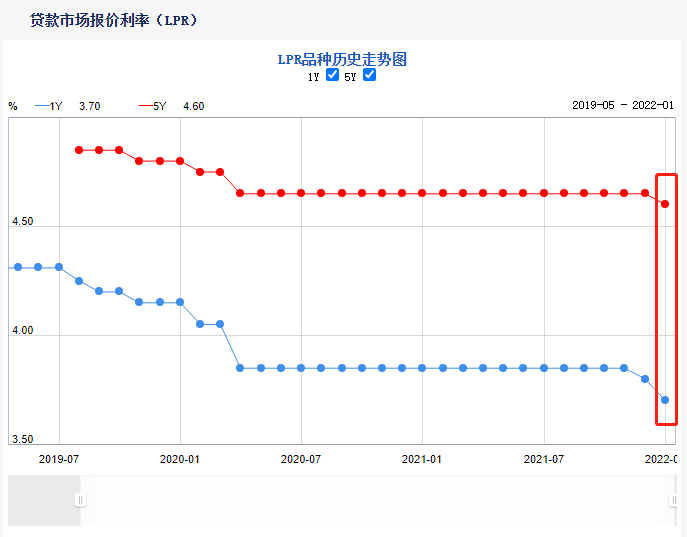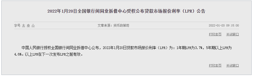 2022年1月20日貸款市場報價利率(LPR)為:1年期LPR為3.7%,5年期以上LPR為4.6%。