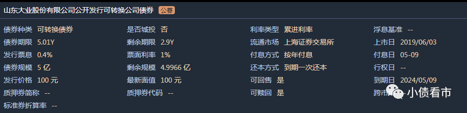 《小債看市》統計,目前大業股份僅存續一只“大業轉債”,債券余額5億元,票面利率0.4%,起息日為2019年5月9日,到期日為2024年5月9日。