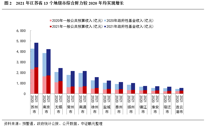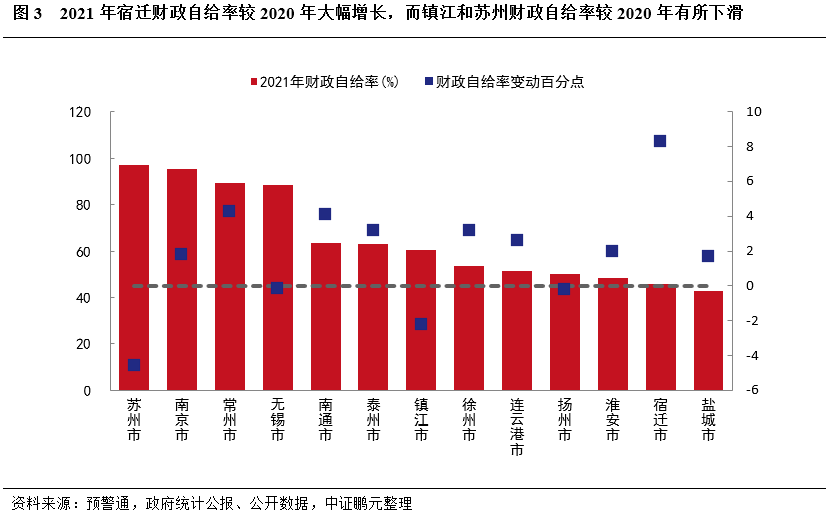 財政自給率方面,2021年蘇州和鎮江財政自給率較2020年分別下滑4.59個百分點、2.20個百分點至97.15%和60.29%,無錫和揚州財政自給率基本和2020年持平,宿遷財政自給率提升較為明顯,2021年宿遷財政自給率上升8.28個百分點至45.80%,主要系2021年宿遷綜合財力較2020年增加明顯,且一般公共預算支出變動不大所致。