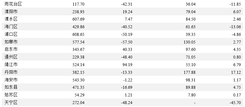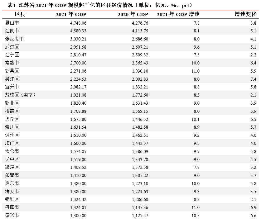 2021年除邗江區外,江蘇省其他各區縣GDP規模均有所提升,響水縣GDP增速下滑0.1個百分點。2021年江蘇省各區縣GDP規模大多處于增長狀態,其中昆山、江陰和張家港市GDP規模仍處于頭部位置,且2021年張家港GDP突破三千億大關,新吳區和宜興市則突破兩千億大關。但邗江區2021年GDP下滑10.72億元至1,117.29億元。GDP增速方面,除盱眙縣、沛縣、贛榆區和豐縣未獲得GDP增速外,2021年江蘇省大部分區縣GDP增速均高于2020年,但響水縣GDP增速下滑0.1個百分點至6.0%。