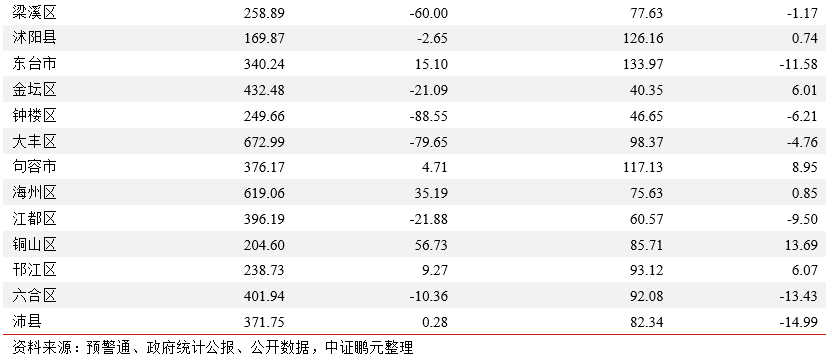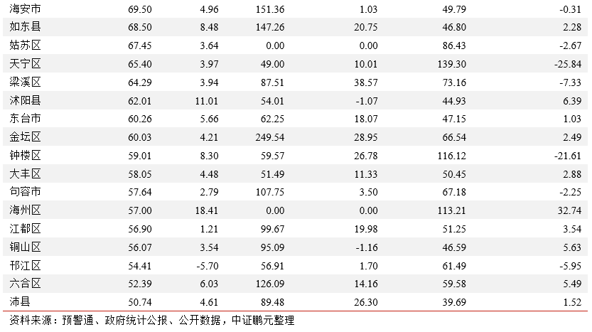 財政情況:2021年宿遷財政自給率大幅提高,95個區縣中有33個區縣財政自給率表現弱于去年。2021年江蘇省各地級市一般公共預算收入和政府性基金收入均較2020年有所提高,2021年宿遷財政自給率表現亮眼,較2020年提高8.28個百分點至45.80%,蘇州、南京、常州和無錫經濟實力依舊較強、財政自給率依舊較高。區縣層面,2021年江蘇省絕大部分區縣一般公共預算收入和政府性基金收入均有所增長,昆山、江陰和江寧區一般公共預算收入仍穩居頭部,但2021年邗江區一般公共預算收入下滑5.70億元至54.41億元,吳江區政府性基金收入下滑64.39億元至171.04億元,相城區、京口區、天寧區、吳江區和鐘樓區財政自給率較去年同期下降20個百分點以上。