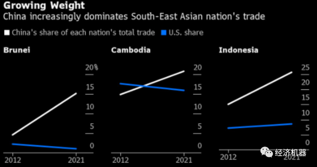 2012 年開始,東南亞國家聯盟 (Asean) 成員國之間的協議例行協調,如今,包括中國在內,已成為世界上最大的自由貿易集團。區域全面經濟伙伴關系(全稱)于1月1日生效。從廣義上講,它旨在降低16個與東盟有貿易往來的國家之間的關稅和其他商品貿易壁壘。在印度于2019年退出后,這一數字降至15,稱其希望保護服務業工人和農民。還有人擔心該國會被來自中國的廉價商品淹沒。美國并沒有被刻意排除在 RCEP 之外。它首先需要與東盟達成自由貿易安排,然后申請加入。同時,該協議堅定地強調了中國在該地區貿易中的主導地位。隨著美國前總統唐納德特朗普敦促他們避開中國的基礎設施貸款和 5G 技術,中國一直在尋求進一步與鄰國融合。