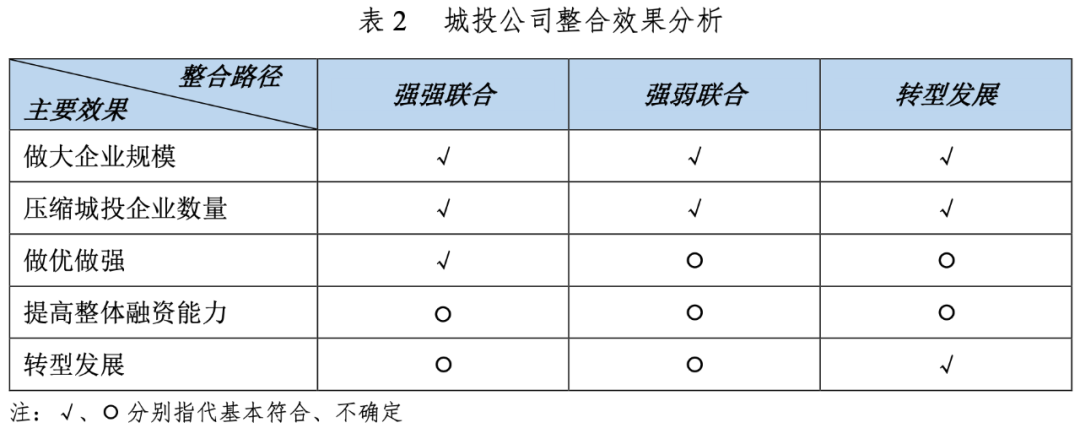 為了提高融資能力而進行城投公司整合,其主要路徑包括“強強聯合”和“強弱聯合”。如果該地區融資環境和城投企業質量整體較好,為了尋求區域城投公司信用水平的進一步提升,地方政府往往選用強強聯合的路徑,以當地質量最好且旗鼓相當的城投公司為核心進行城投公司整合。如果該區域僅有一家規模明顯大于其他公司的城投公司,而質量較為一般的城投企業占多數,甚至陸續發生融資受阻的情況,城投公司整合的路徑則采取強弱聯合的方式。在此整合模式下,需要關注的問題是,整合是否僅止步于完成股權變更手續,后續對公司內部進行實質業務整合和管理整合的情況,能否達到提高公司融資能力的目標需要具體研究。