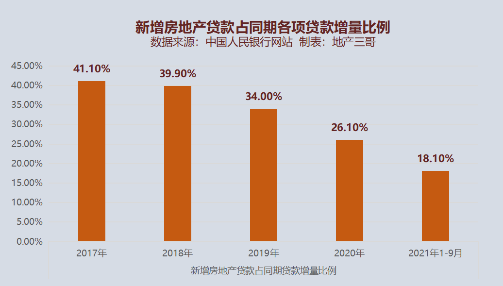 首先,看新增房地產貸款總量占比,2018年以來,新增房地產貸款占比逐年下降。今年前三季度,新增房地產貸款占各項貸款增量的比例只有18.10%,創多年以來的新低。
