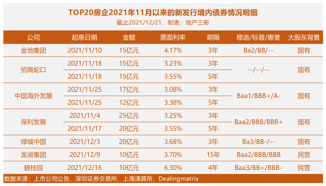 進入11月份之后,TOP20房企中發行中期票據(公司債券)的房企有金地、招商蛇口、中海、保利、綠城和龍湖、碧桂園。