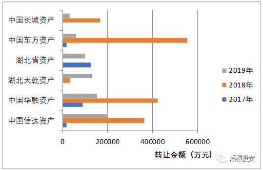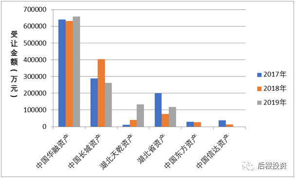 與去年相同,華融資產(chǎn)、長城資產(chǎn)兩家收購量依舊搶眼,作為一級(jí)市場(chǎng)主要持牌AMC受讓方占據(jù)接近80%的市場(chǎng)份額。而成立于2016年底的湖北天乾資產(chǎn)后來居上,受讓金額逐年攀高。