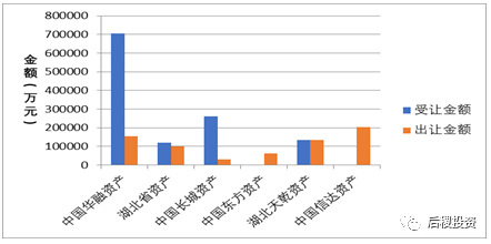 圖中數(shù)據(jù)為持牌AMC在整個(gè)不良市場(chǎng)所有收包、出包金額統(tǒng)計(jì),僅根據(jù)當(dāng)前數(shù)據(jù)統(tǒng)計(jì),湖北省資產(chǎn)和湖北天乾資產(chǎn)收、出包金額較平衡;華融、長城收包>出包金額,東方、信達(dá)由于成交記錄未透露具體債權(quán)金額,暫不予分析。