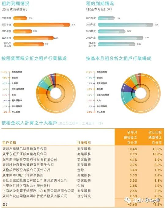 以香港和新加坡的REITs年報為例,除了對總體的運營情況進行說明外,大多數管理人還會對每一個投資的項目進行運營情況的披露,其中涉及各項目更加具體的一些運營指標,比如:加權平均剩余租期、租約到期情況分布、租戶行業構成、十大租戶、租金增長率等等。