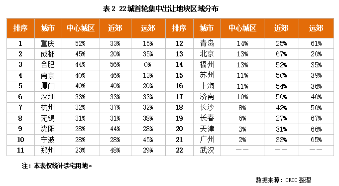 而在供地結構方面,除重慶、成都等少數城市將供地主力放在中心城區外,其余城市的供地主力集中在郊區,供應量占比基本都在6成以上,中心城區則僅有少量地塊供應。