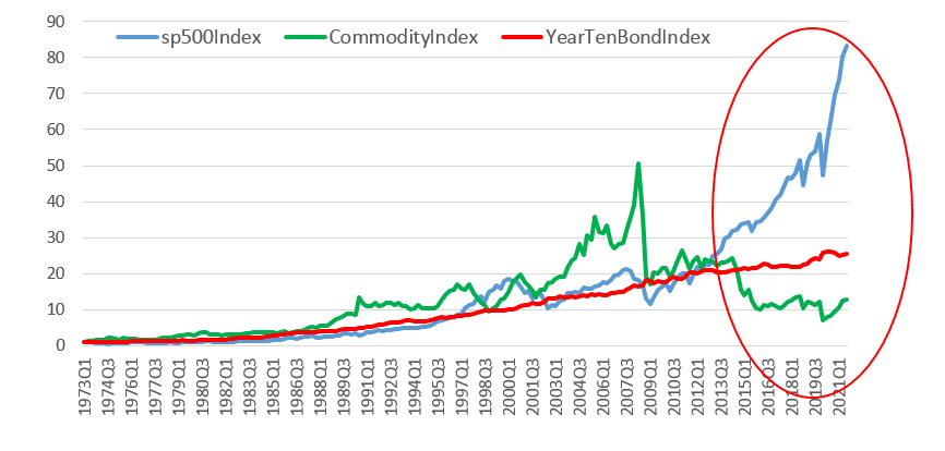 對于標普500指數而言,很明顯的看到,2010年以后,標普500指數對其他資產的優勢呈現出加速的跡象。
