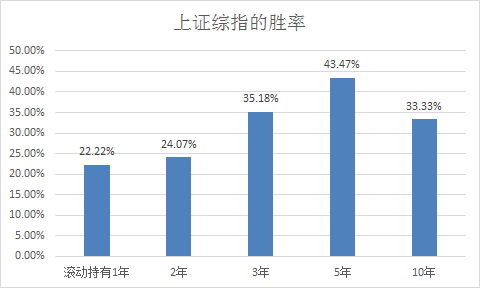 但是如果統計上證綜指、中證債券總財富指數、南華工業品指數的話,這個數據顯得差了很多。上證綜指持有一年的勝率只有22%,持有5年的勝率也沒有超過50%。這說明,滾動持有5年,上證綜指的戰勝工業品指數、債券指數的概率也不到50%。