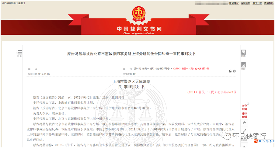 以律所作為訴訟對(duì)手,無疑是有一定難度,特別是面對(duì)多次見財(cái)起意與委托人發(fā)生糾紛的北京惠誠律所上海分所以及沒有道德底線受到律協(xié)“公開譴責(zé)”處分的王濤律師;不過再難也有正義也有公理;面對(duì)律所的施壓,委托人除了應(yīng)訴,向律協(xié)投訴無疑也是一個(gè)很好的選項(xiàng),律協(xié)已立案受理投訴。